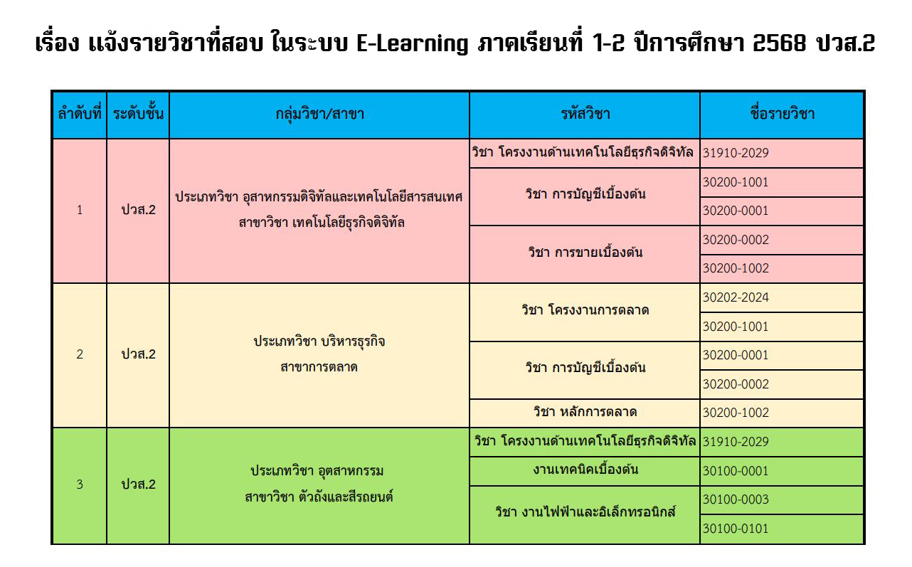 ตารางสอบ ปวช.2 ระบบ online learning เทอมที่ 1-2 ปีการศึกษา 2568